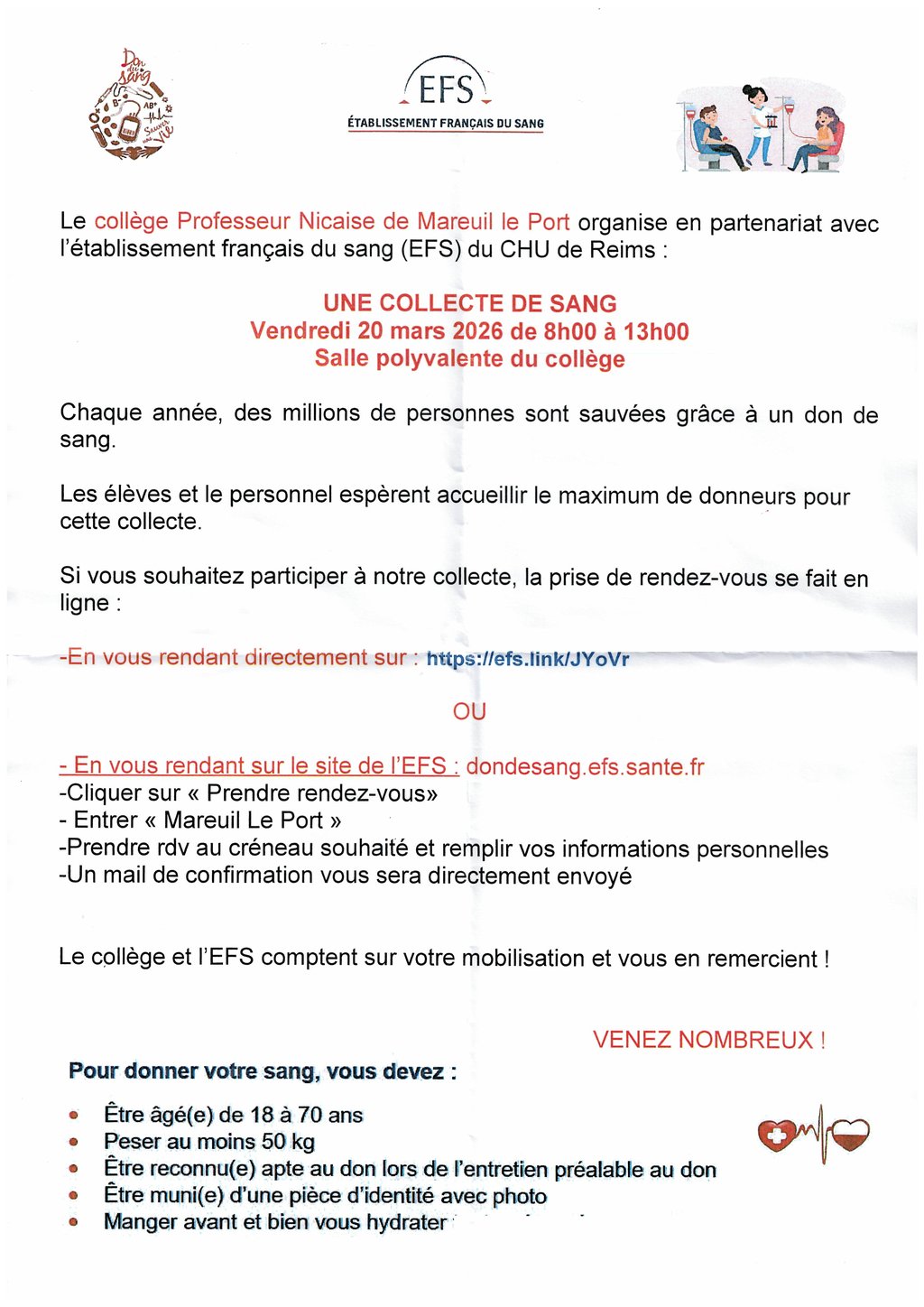Une collecte de sang est organisée le vendredi 20 mars 2026, de 8h00 à 13h00, dans la salle polyvalente du collège de Mareuil-le-Port.