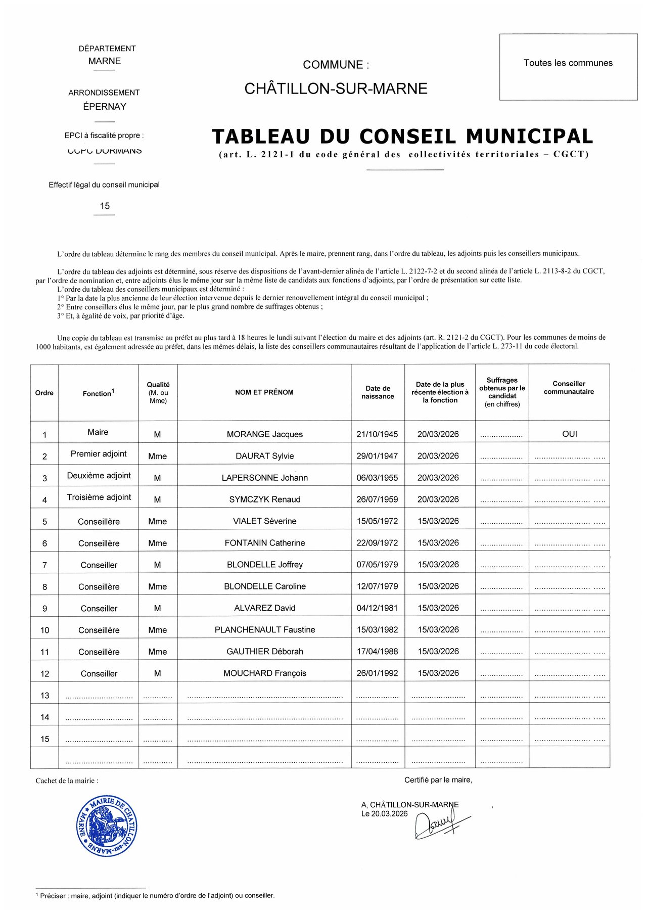 Veuillez trouver ci-dessus le tableau du conseil municipal mis en place le vendredi 20 mars 2026.