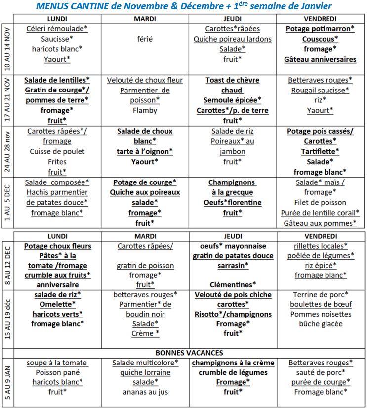En pièce jointe les menus qui seront servis à la cantine pour les mois de novembre & décembre 2025 + la 1ère semaine de janvier 2026