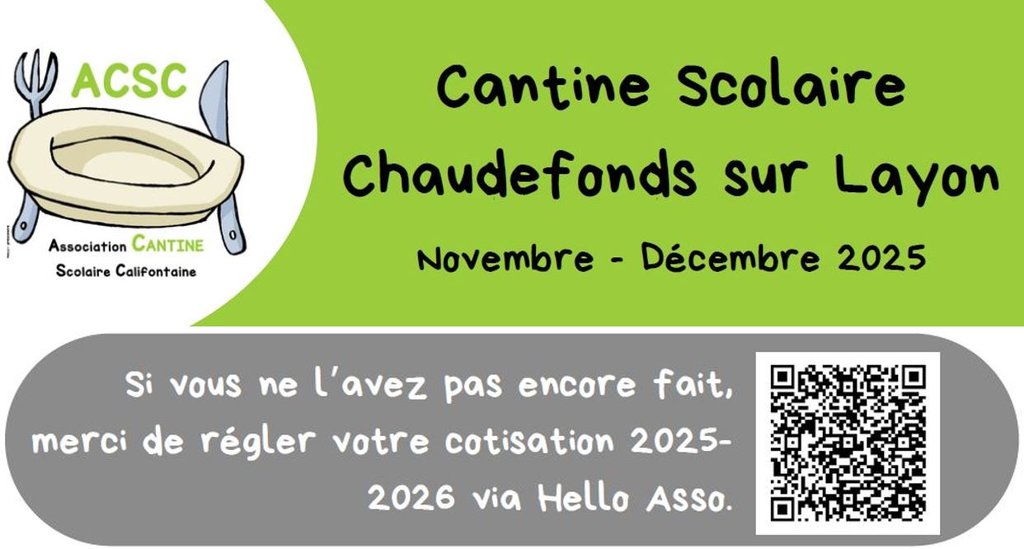 La cantine scolaire de Chaudefonds-sur-Layon (ACSC) est gérée par une association composée des parents d’élèves. Les inscriptions à la cantine et à la périscolaire se font en ligne via le portail famille (pour vous inscrire, contactez la mairie). En cas de problème concernant la réservation des repas, contactez Simon au ☎ tel:06 07 08 41 04.