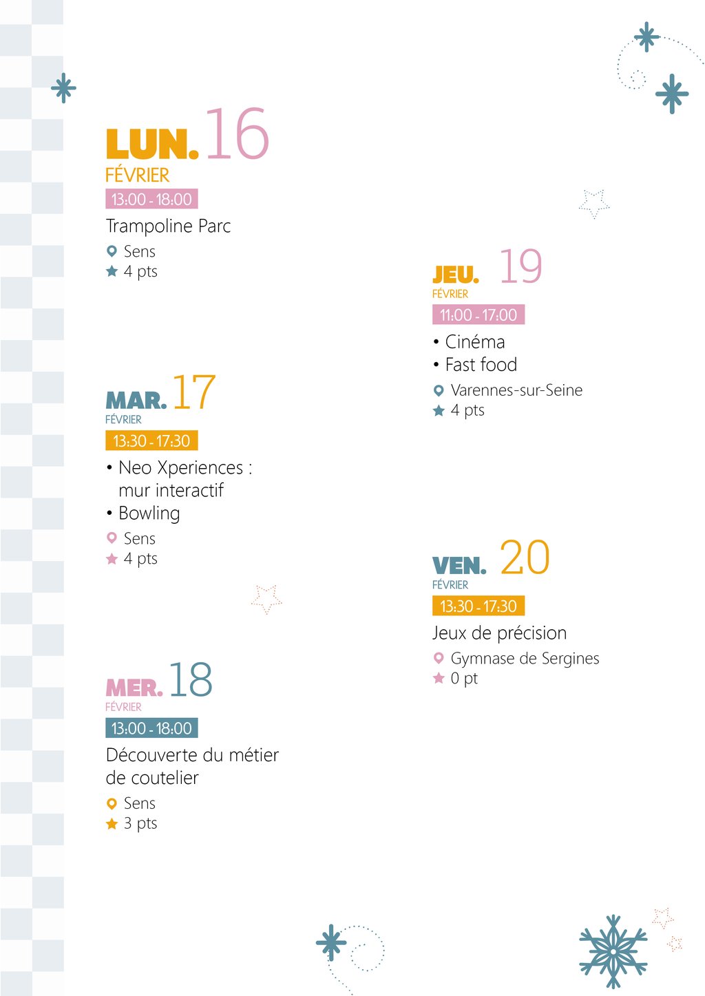 L'hiver a pointé le bout de son nez et signe le retour des vacances au sein de l'accueil ados ! L'occasion de faire le plein d'activités : trampoline parc, neo xperience, bowling, découverte du métier de coutelier, séance de cinéma mais aussi jeux de précision attendent nos jeunes du 16 au 20 février.