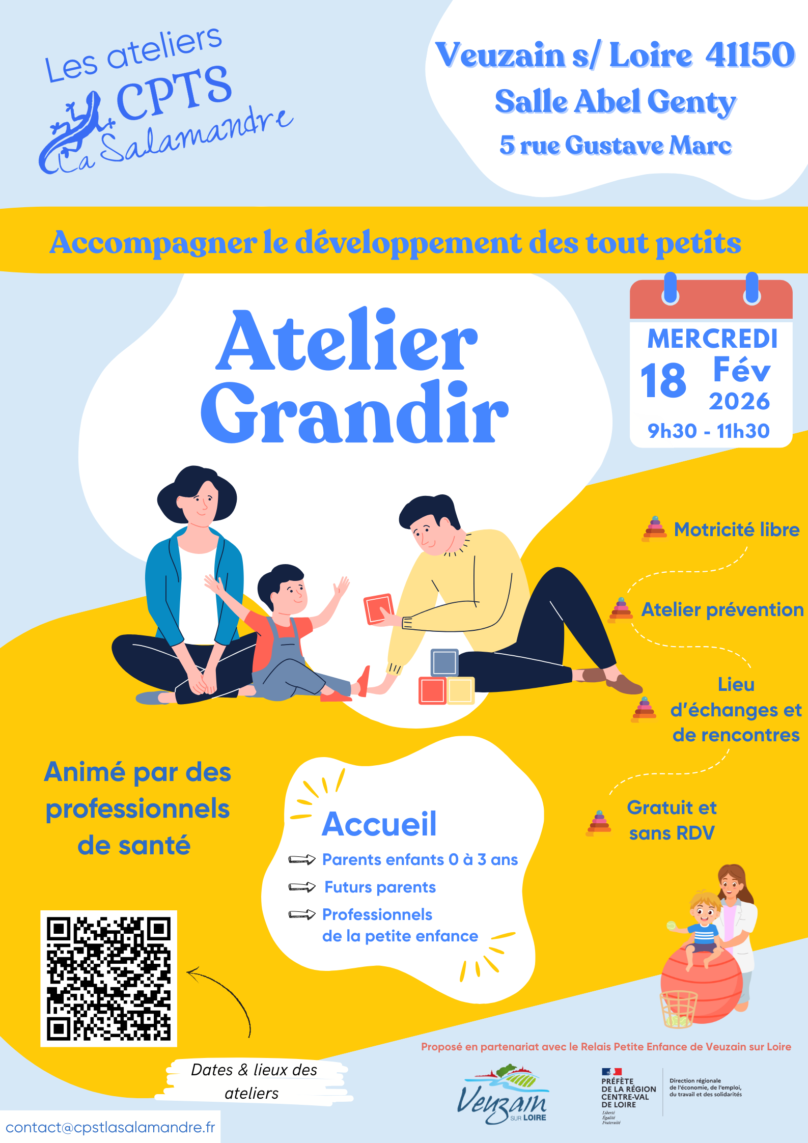 Le prochain atelier Grandir aura lieu le mercredi 18 février prochain à la salle Abel Genty, 5 rue Gustave Marc à VEUZAIN SUR LOIRE (41150).