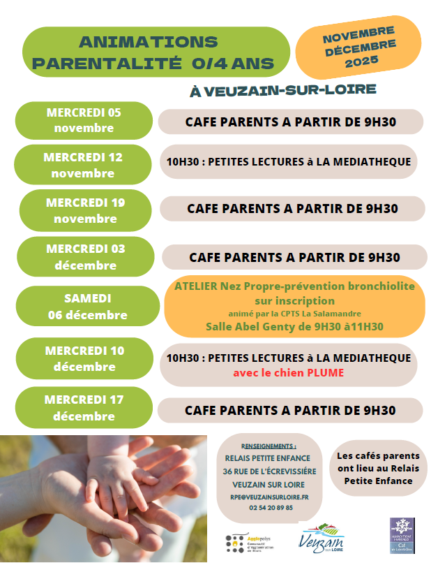Voici les prochaines animations parentalité proposées par le Relais Petite Enfance, de novembre et décembre 2025.
