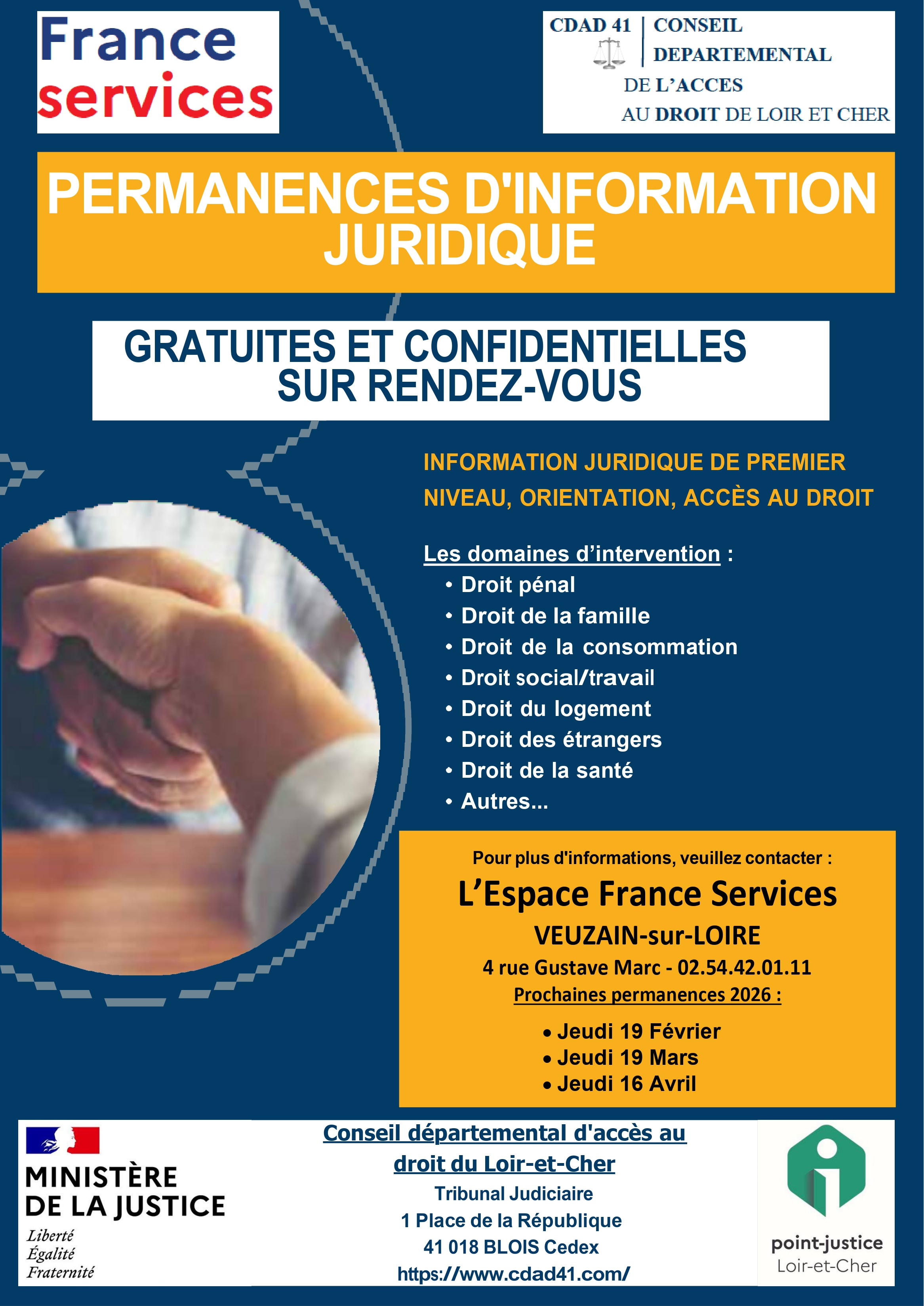 Le Conseil Départemental de l’Accès au Droit de Loir-et-Cher met à notre disposition une juriste généraliste dont les domaines d’interventions sont variés : droit de la famille, droit pénal, droit administratif, droit des étrangers, droit de la consommation, droit du travail, droit du logement, droit de la santé…