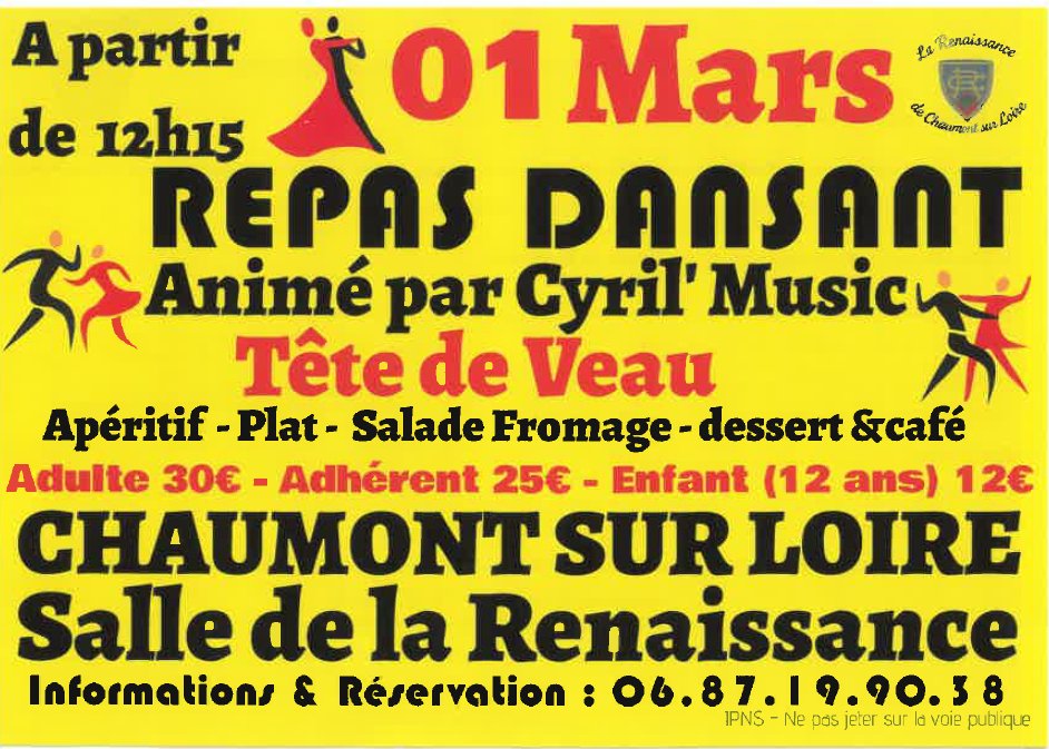L'Association La Renaissance de Chaumont-Sur-Loire organise un repas dansant spéciale "Tête de veau" avec possibilité de plat de substitution : blanquette.