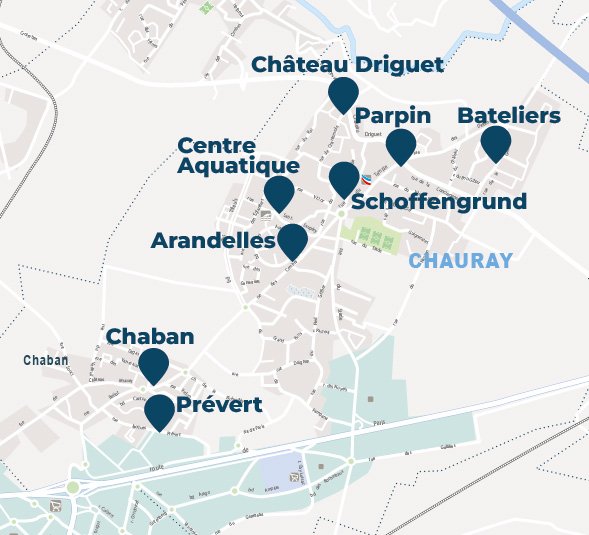 >>> Emplacements : Arandelles, Bateliers, Centre Aquatique, Chaban, Château Driguet, Parpin, Prévert, Shoffengrund.