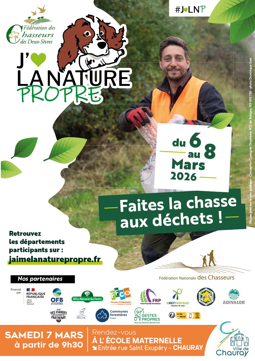 ➡ De nombreux dépôts sauvages et déchets s’accumulent encore trop souvent dans nos campagnes, nos fleuves et nos rivières… C’est pourquoi, la Fédération Départementale des Chasseurs des Deux-Sèvres en partenariat avec le Conseil Municipal des enfants de la commune de Chauray, vous invitent à participer à une matinée de ramassage des déchets le Samedi 7 Mars.