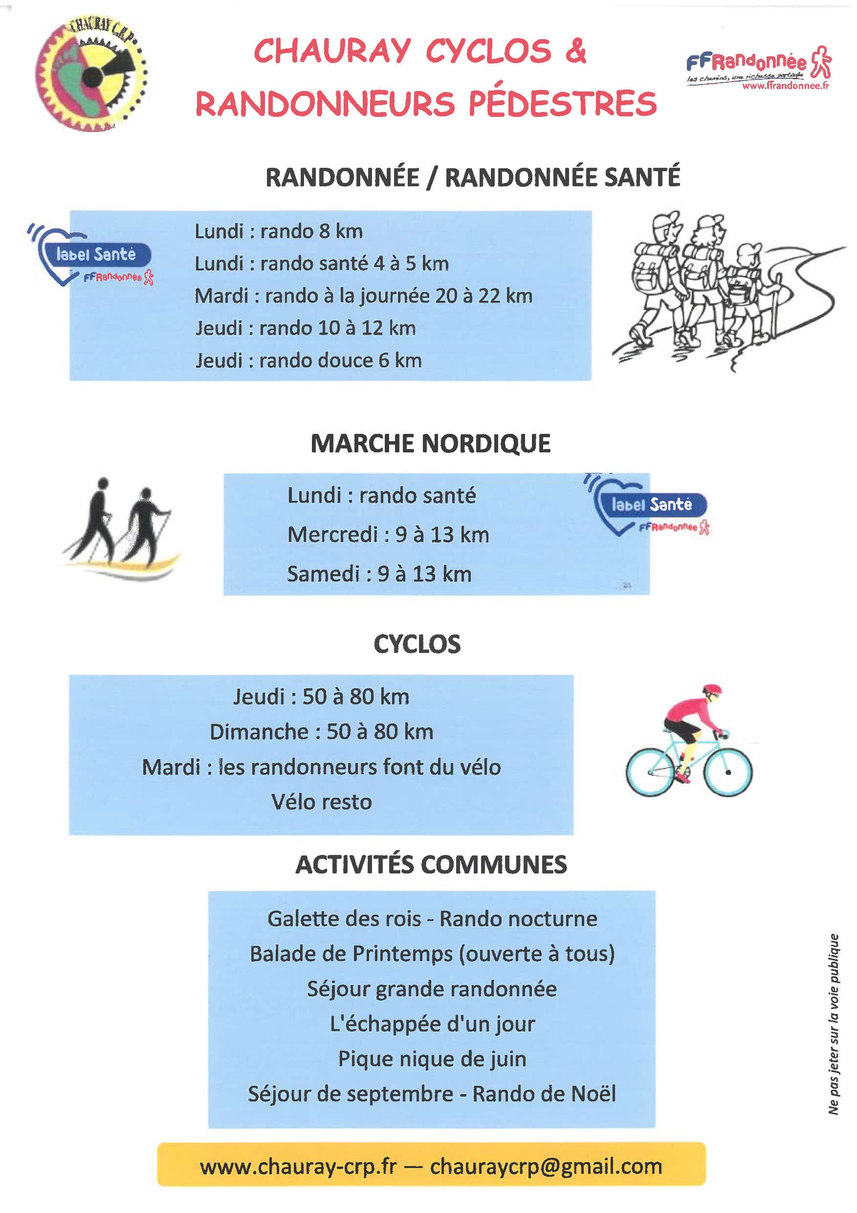 L’association C.C.R.P (Chauray Cyclos & Randonneurs Pédestres) propose 3 activités principales :