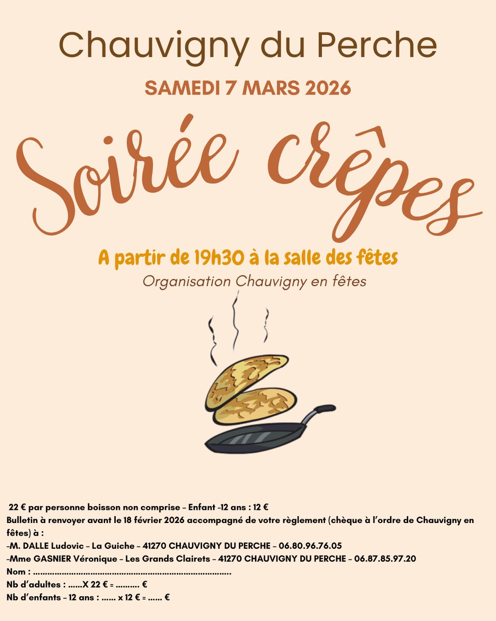 Soirée Crêpes le 07 mars prochain à 19h30 à la salle des Fétes sur réservation.