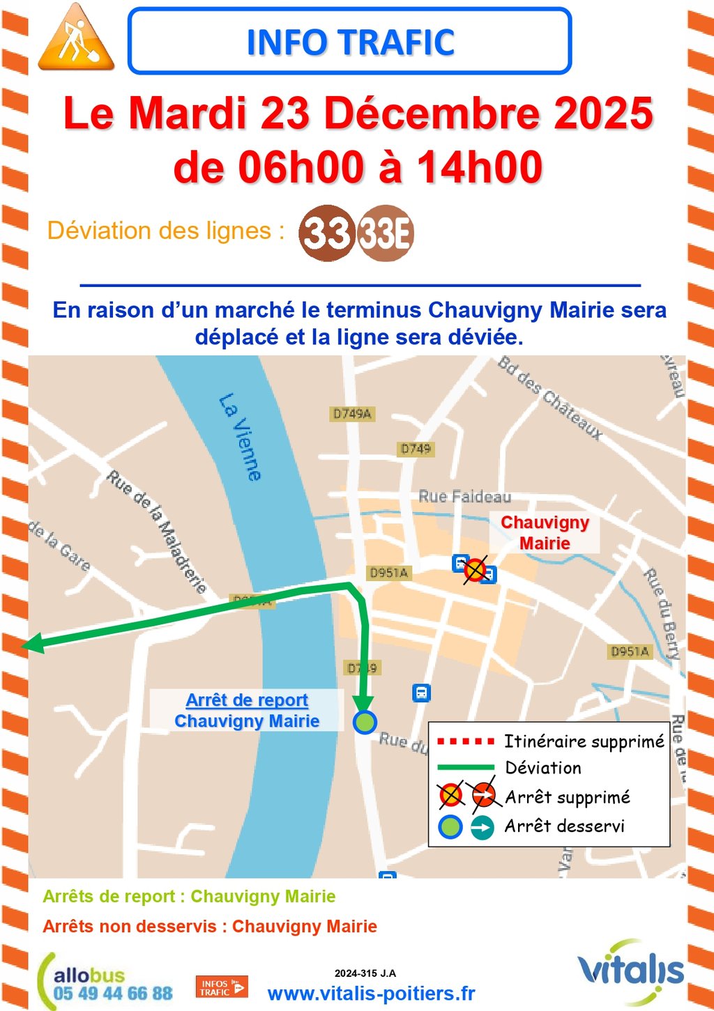 En raison de l'organisation d'un marché alimentaire, spécial Noël, proposé sur la place face à la mairie, mardi 23 décembre au matin, pour des raisons de sécurité, les arrêts voyageurs en provenance de Poitiers, sont déplacés :