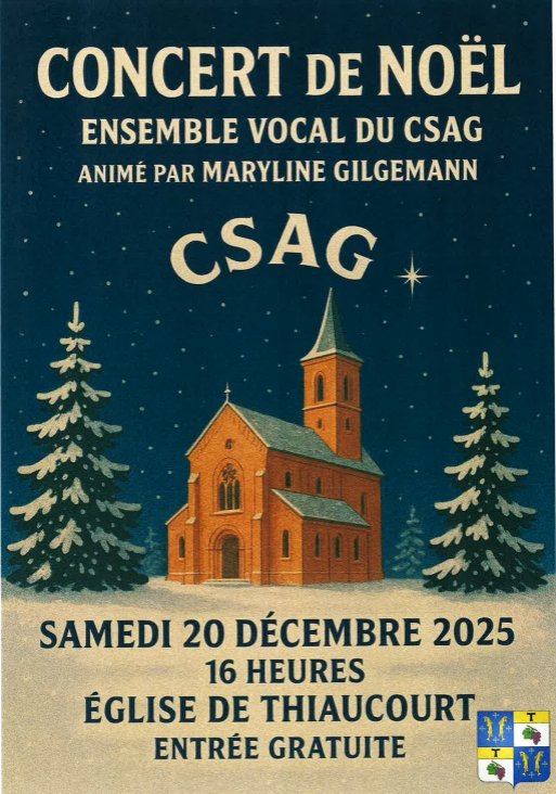 Le samedi 20 décembre à partir de 16h, l'ensemble vocal du CSAG vous propose d'assister à un concert de Noël animé par Maryline GILGEMANN qui aura lieu à l'église de Thiaucourt !