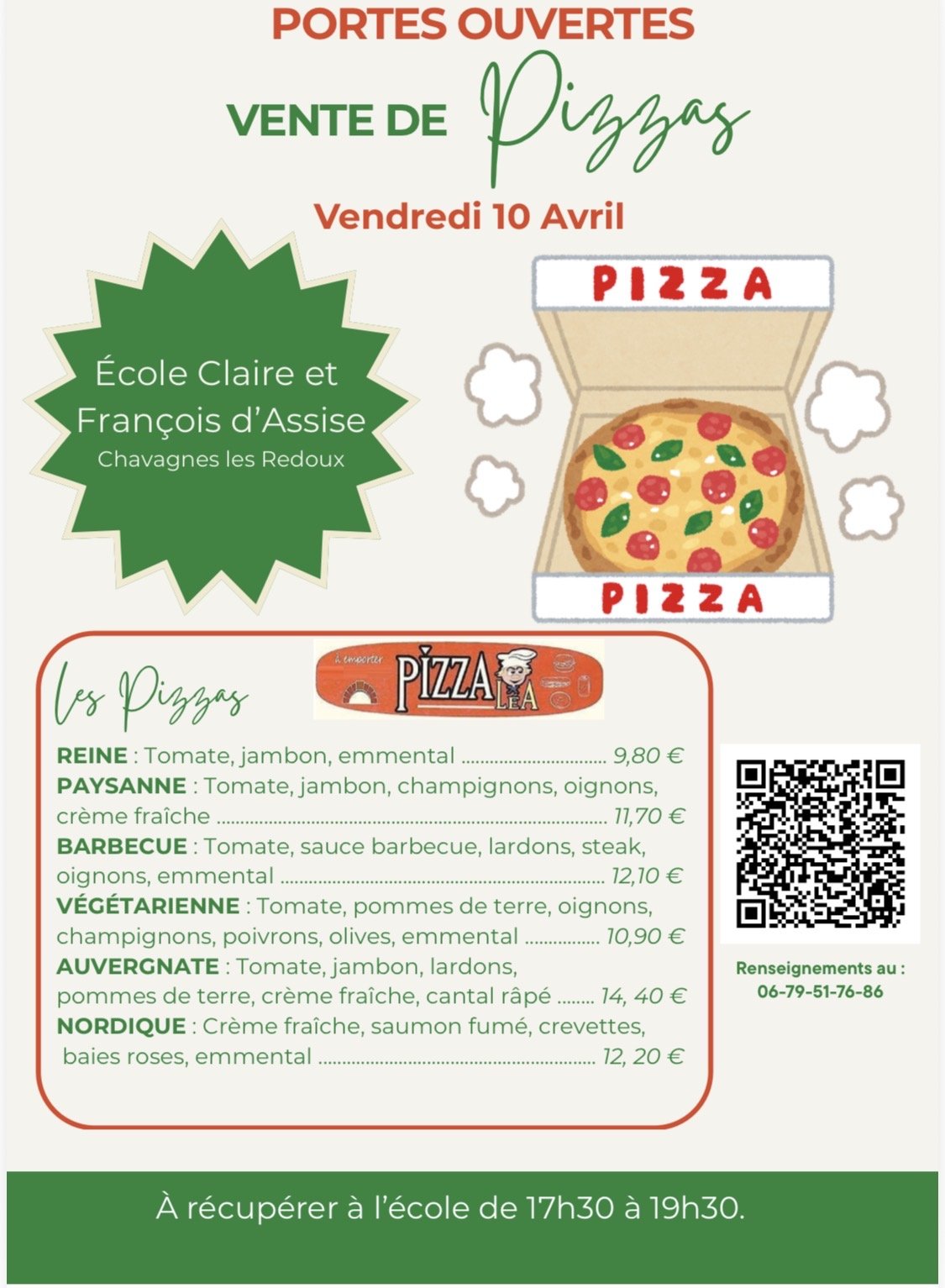 L’Ecole claire et François d’assise organise une vente de pizzas à récupérer à l’école le 10 avril entre 17h30 et 19h30.