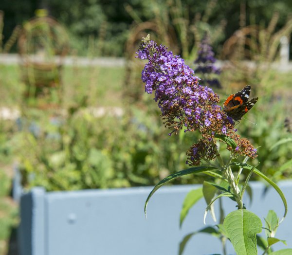 D’un côté, sont disposées trois «couveuses » à chenilles. Garnies d’une végétation propice à leur développement, elles protègent les chenilles tout en nous donnant à voir leur développement depuis le stade larvaire (œuf, chenille puis chrysalide) jusqu’à l’imago (papillon). Elles sont orientées face à une butte plantée de fleurs nectarifères particulièrement appréciées des papillons. Ces derniers n’ont plus qu’à emprunter ce couloir aérien imaginé par Élodie Stephan vers cette destination paradisiaque et pour les publics observer le ballet de la faune et de la flore !