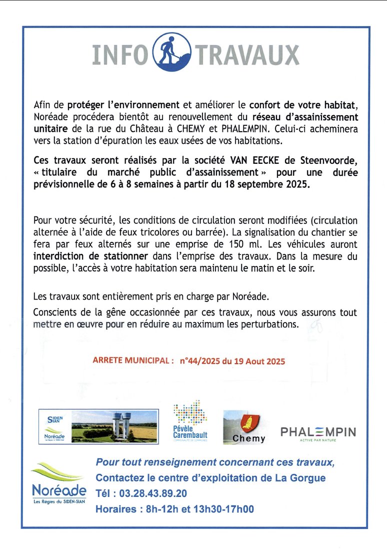 đ Du 18 septembre au dĂ©but novembre, NorĂ©ade procĂšde au renouvellement du rĂ©seau dâassainissement unitaire Ă Chemy et Phalempin.