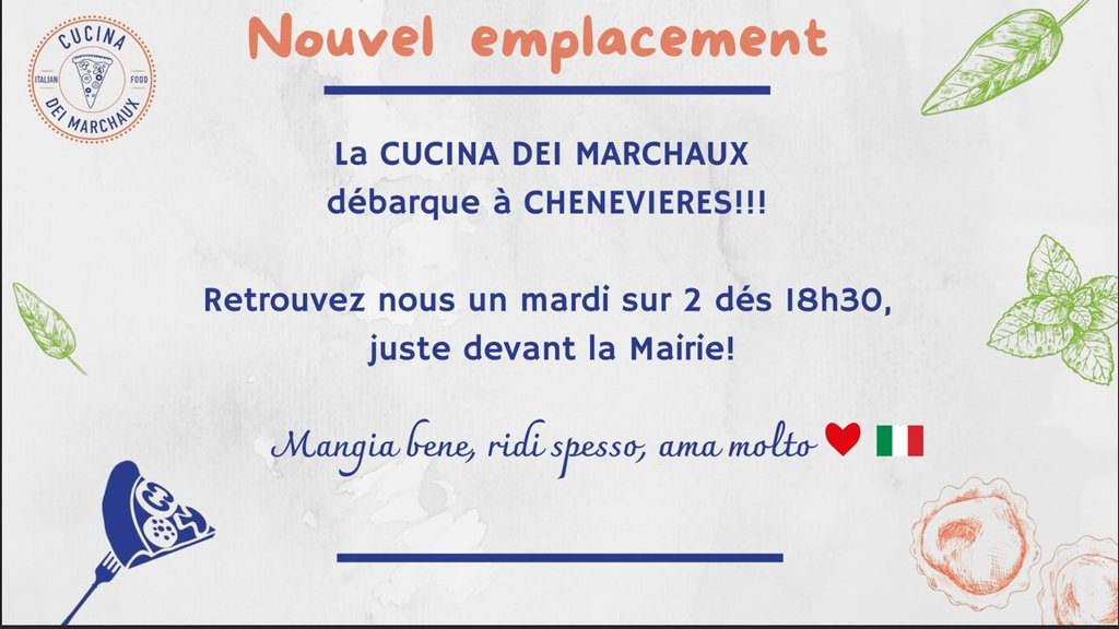 À partir du mardi 4 novembre 2025 à 18h30, un Food-truck de pizzas sera présent place de la mairie à Chenevières.