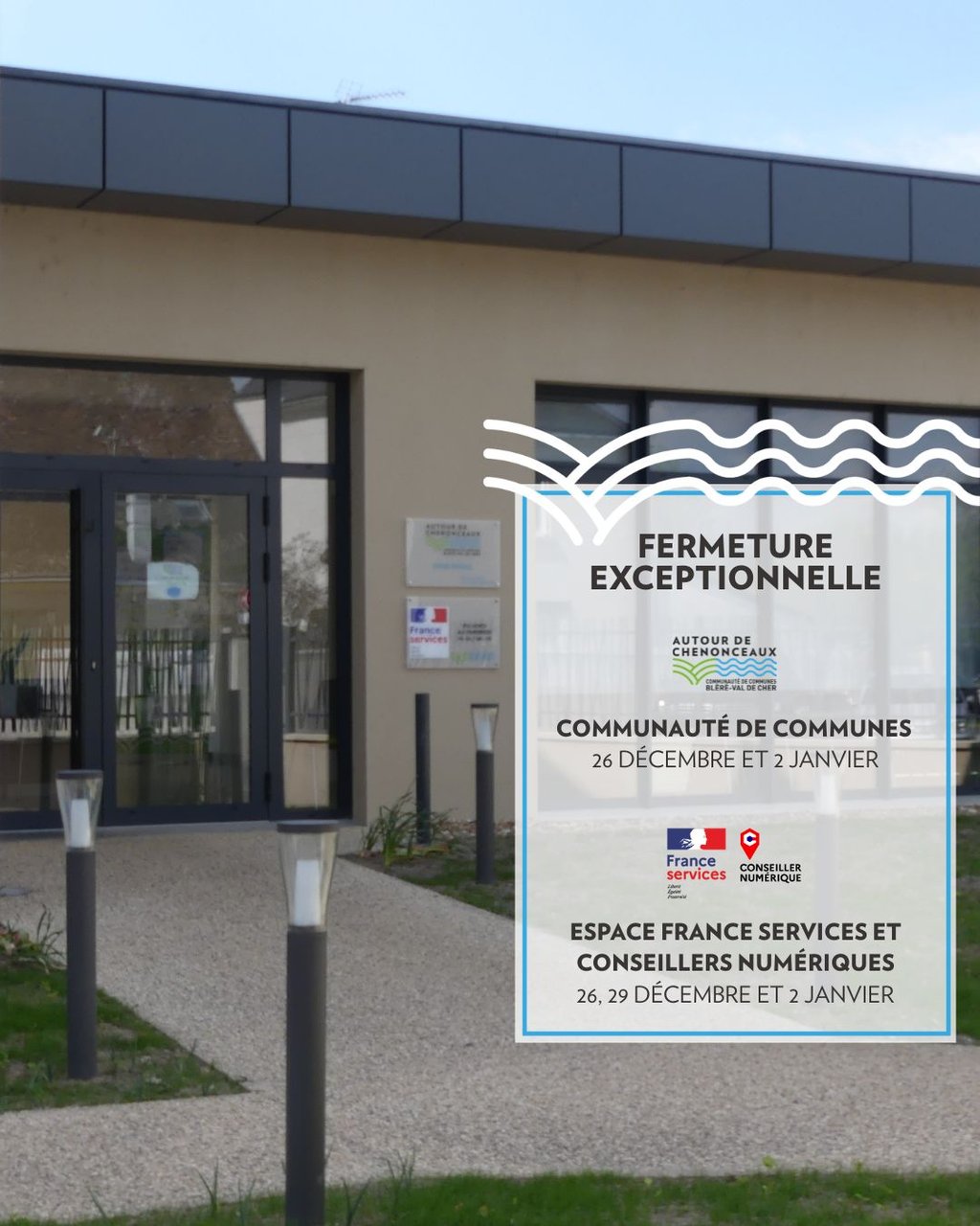 La communauté de communes Autour de Chenonceaux Bléré – Val de Cher sera exceptionnellement fermée les 26 décembre et 2 janvier.