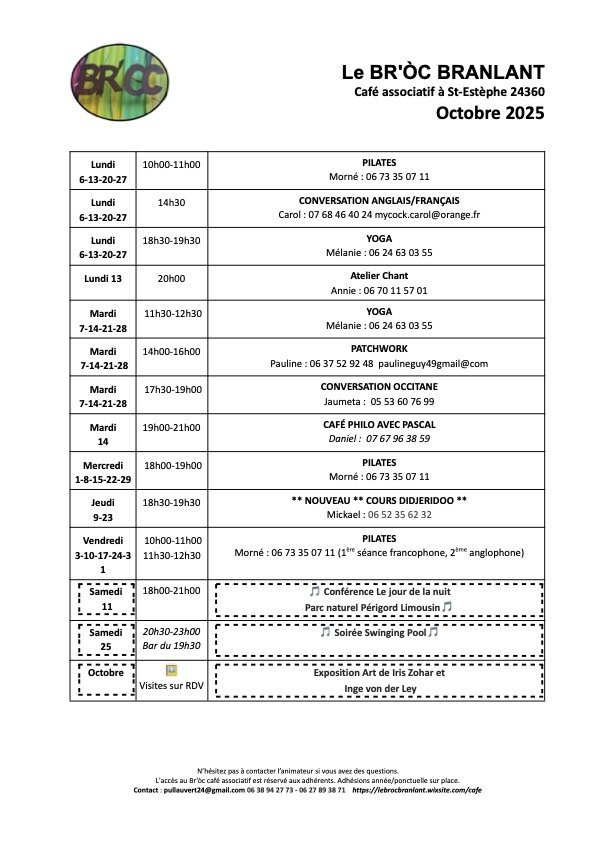 Voici le programme du Br'òc branlant - café associatif de Saint-Estèphe, pour ce mois d'octobre 2025.