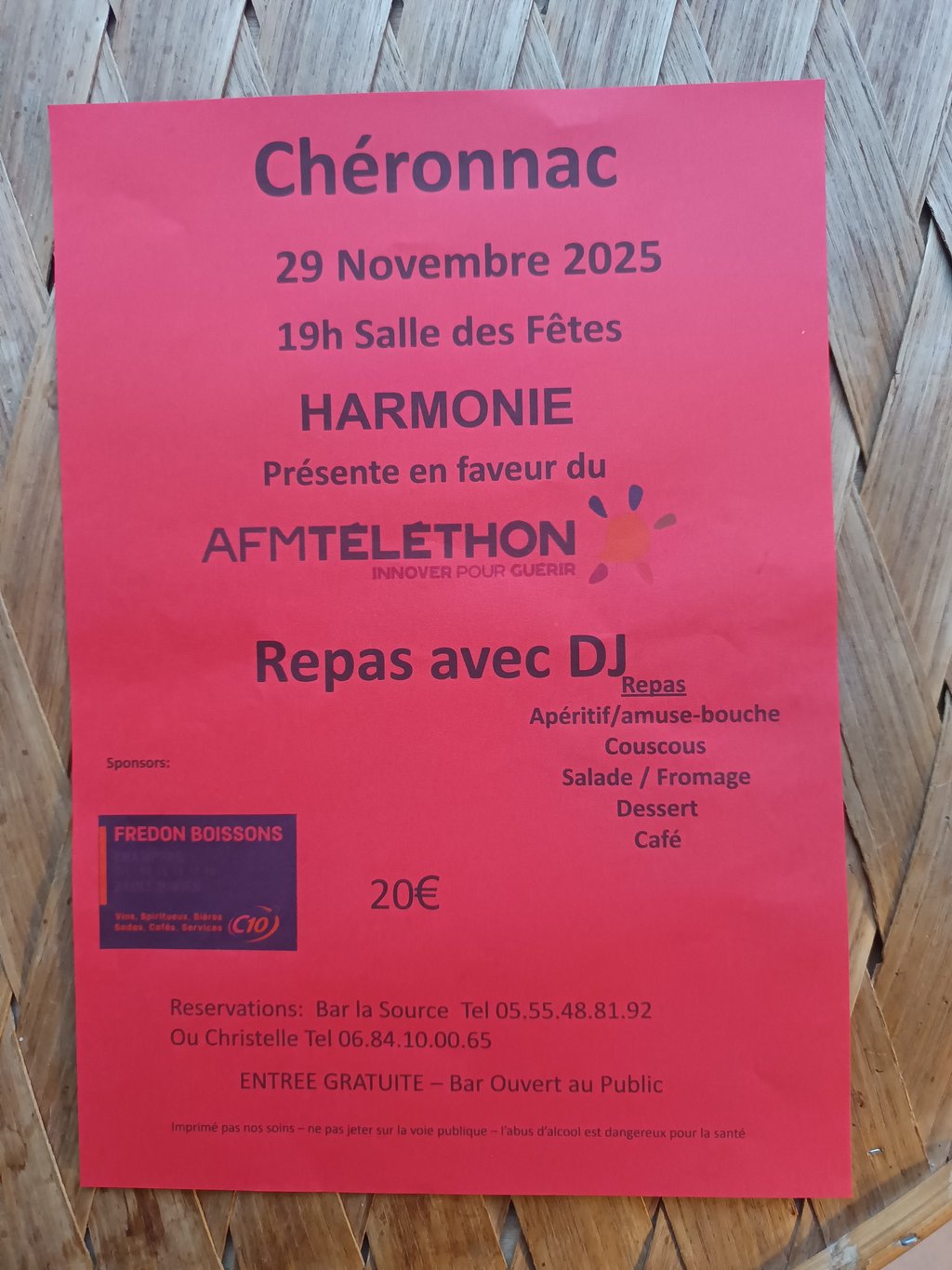 L'association Harmonie organise un repas avec DJ le 29 Novembre à partir de 19 h en faveur du téléthon.