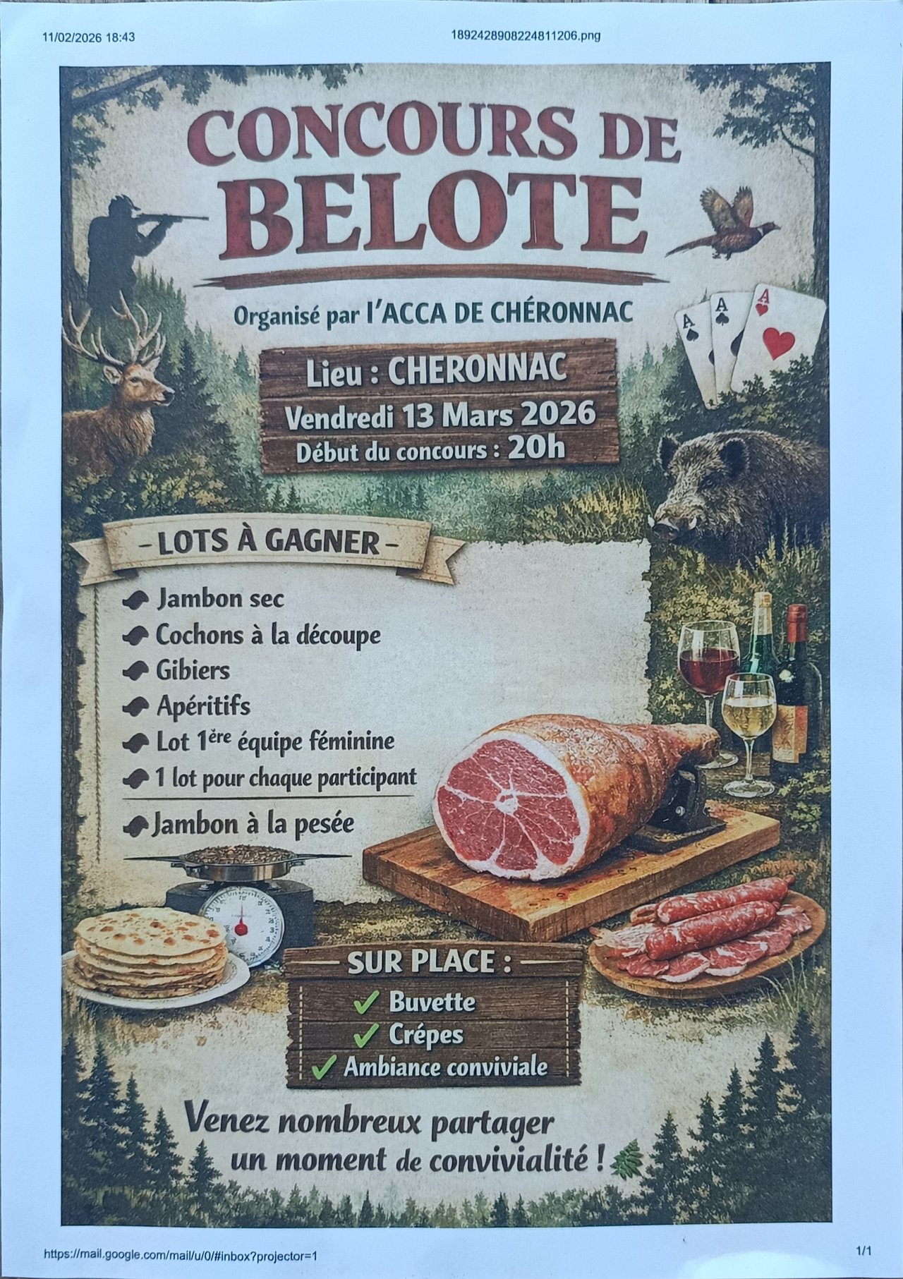 Concours de belote de l'ACCA, le 13 Mars 2026 à la salle des fêtes de Chéronnac.