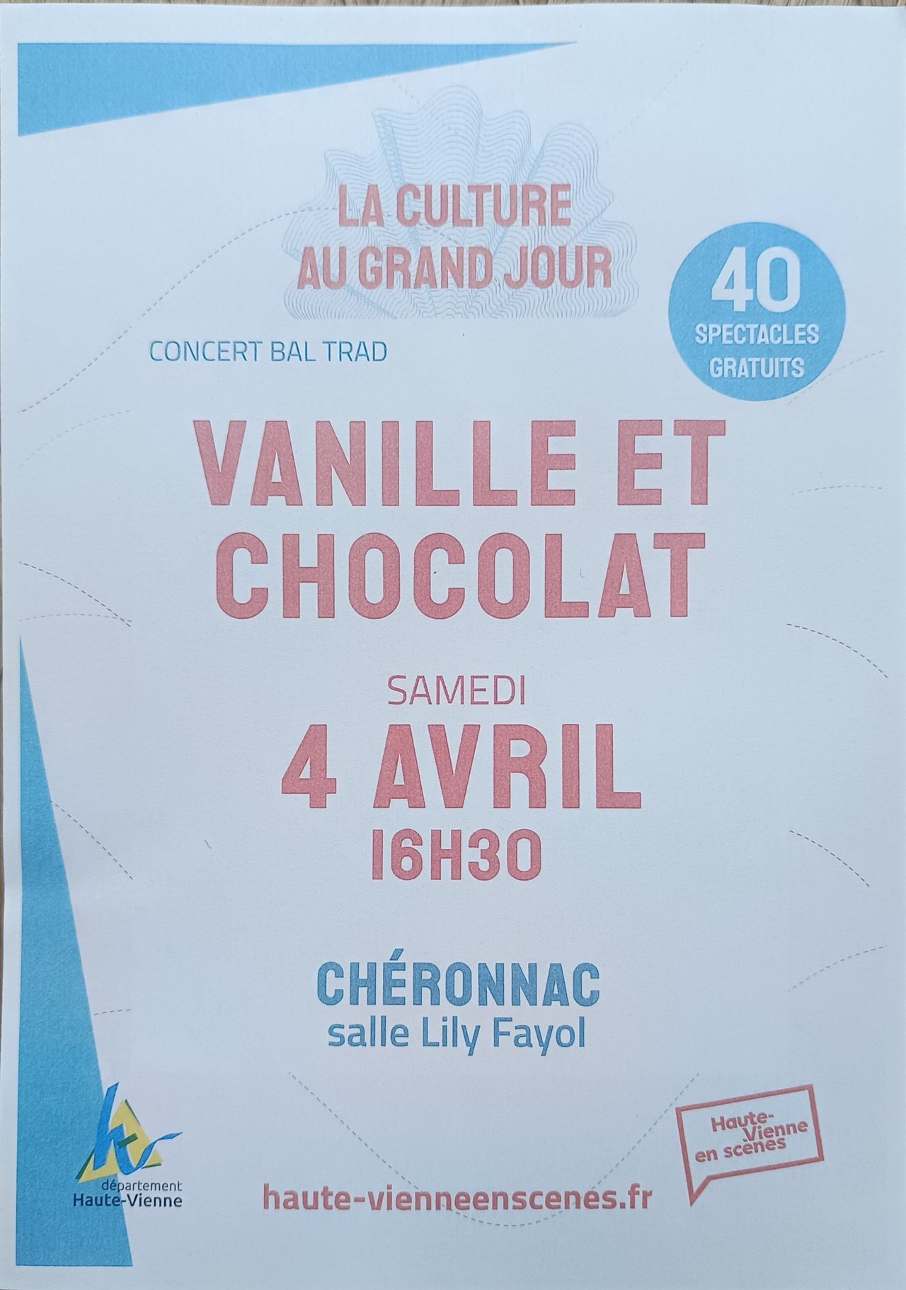 La culture au grand jour propose un concert bal trad par le groupe vanille &chocolat le samedi 4 avril à 16h30 à la salle des fêtes de Chéronnac.