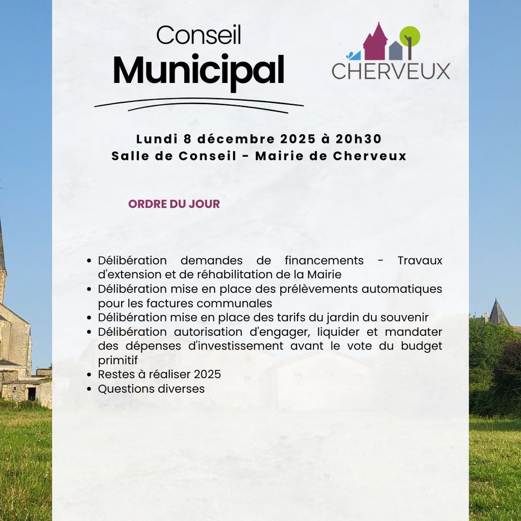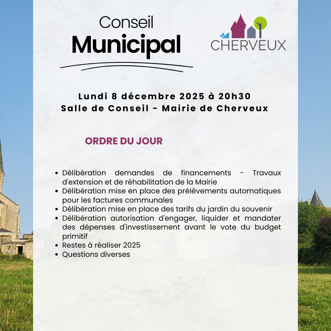Conseil Municipal lundi 8 décembre 2025 à 20h30. Salle de Conseil de la mairie.