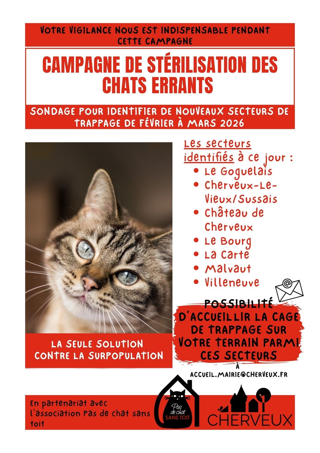 😺Une campagne de capture des chats errants se déroulera du 9 au 20 février 2026 dans le secteur de la rue des Artisans.