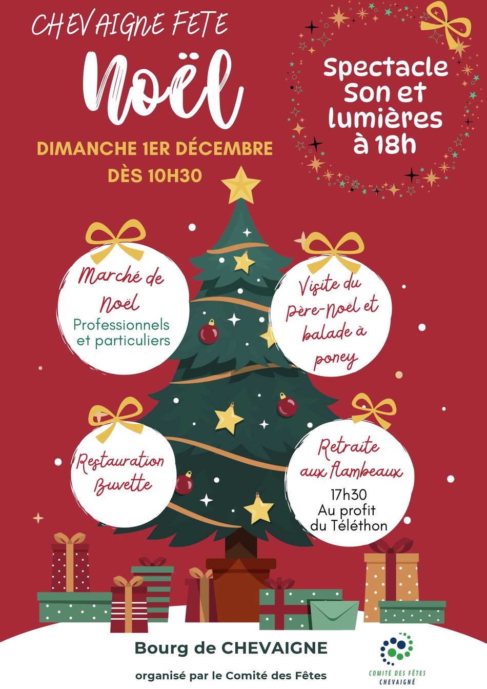 Premier marché de Noël organisé par le Comité des Fêtes, en collaboration avec les commerçants de Chevaigné, le dimanche 1er décembre 2024 place de l’Église et rue d’Ille et Rance, à partir de 10h00.