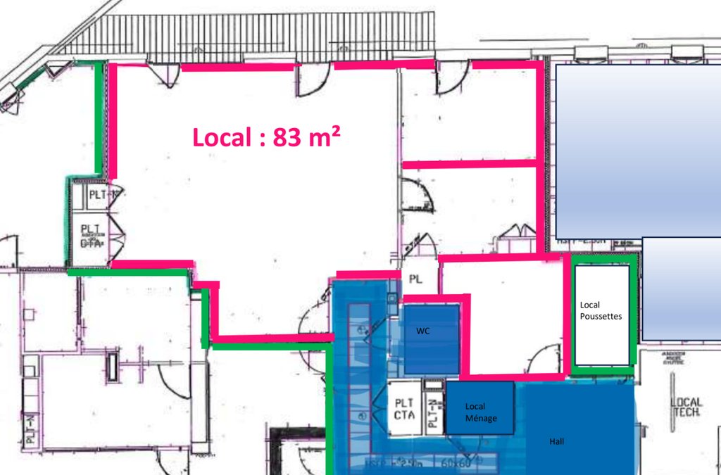 Caractéristiques du local : Surface totale de 83 m² répartis en 3 surfaces, dont une salle d’attente. Les espaces communs sont de 35 m².