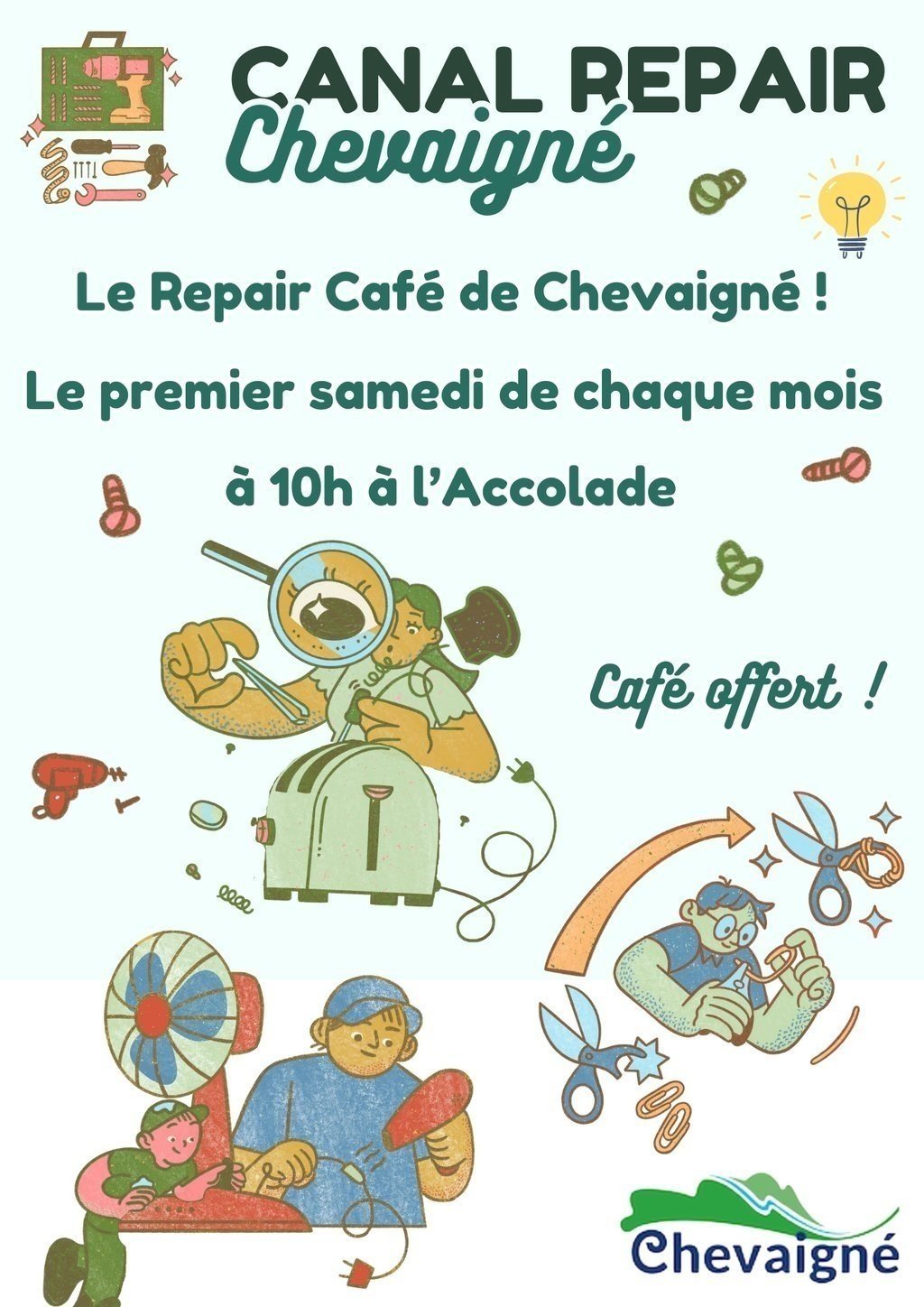 Le Canal Repair Café de Chevaigné s'articule autour de plusieurs ateliers collaboratifs et interactifs, où les participants.es sont invités.es à apporter des objets défectueux (petits appareils électriques ou électroniques).