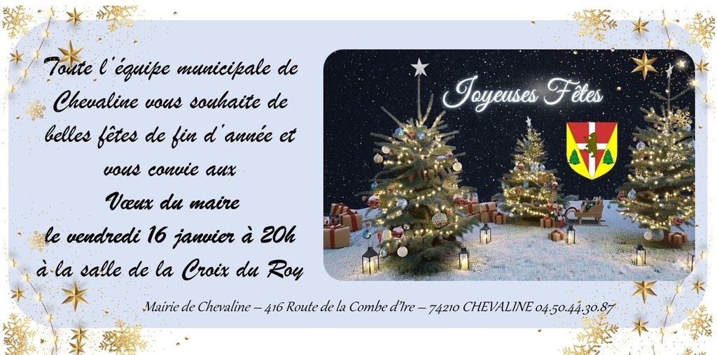 Votre équipe municipale ainsi que le personnel communal vous souhaitent de belles fêtes de fin d'année et vous informent que le secrétariat de mairie sera fermé jusqu'au mardi 06/01/2026 à 9h00.