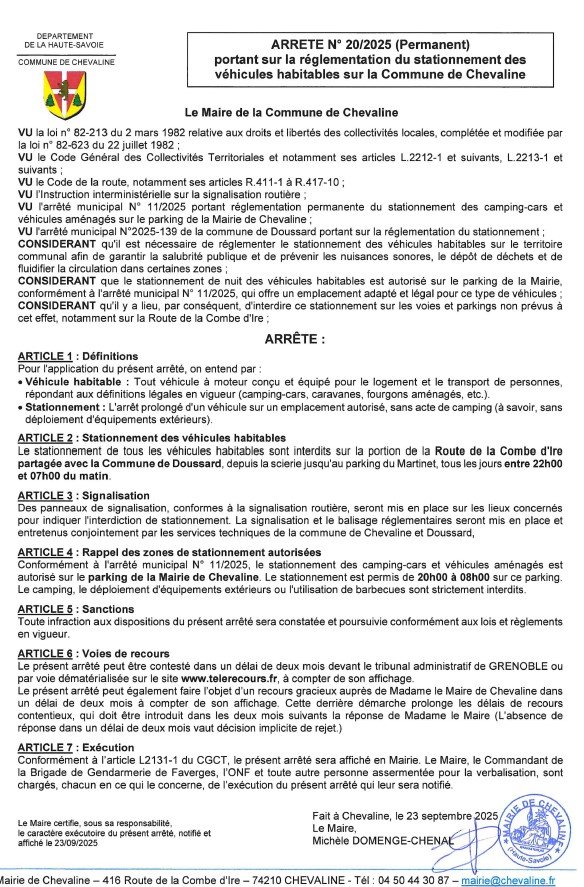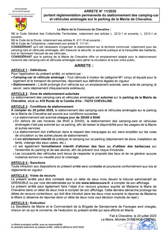 - Depuis le 25/07/2025, la commune de Chevaline a souhaité réglementer le stationnement des camping-cars et véhicules aménagés sur le parking de la mairie, de 20h00 à 8h00 selon arrêté municipal (11-2025) ci-après en vigeur.