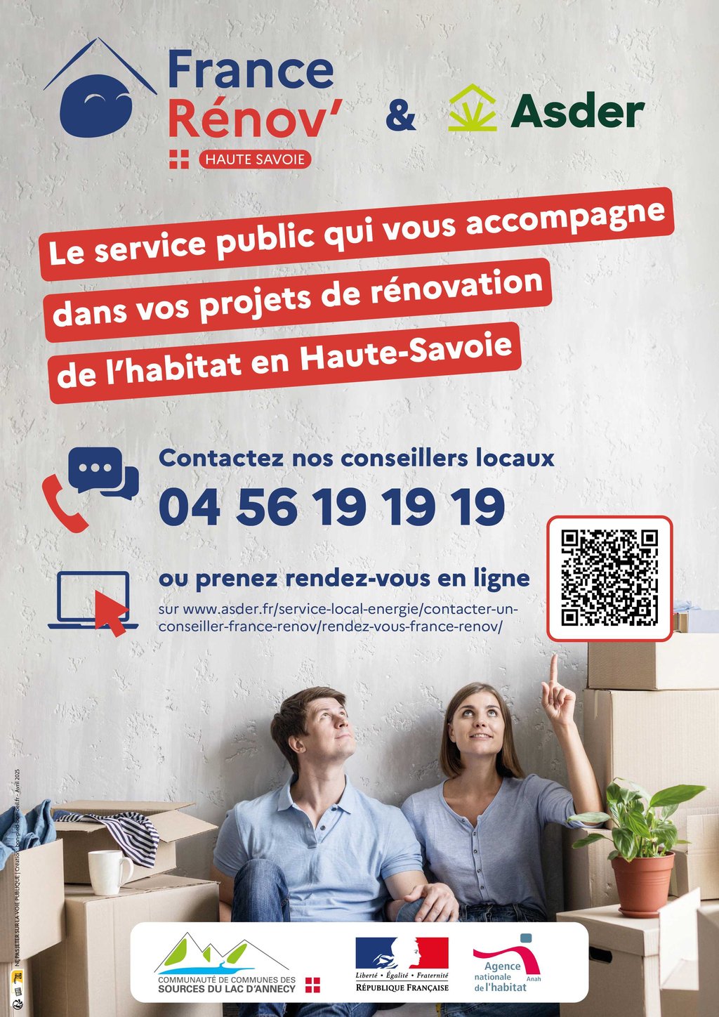 RAPPEL : France Rénov’ Haute-Savoie est un service public local pour vous aider dans vos projets de rénovation : travaux d’isolation, de chauffage, de ventilation, économies d’énergies ou adaptation à la perte d’autonomie. Sur votre territoire, la CCSLA a missionné l'ASDER pour vous conseiller lors de deux permanences par mois.
