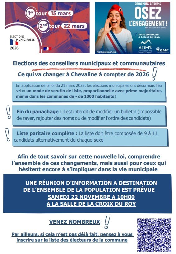 Cette réunion d'information sur le nouveau mode de scrutin applicable aux communes de -1000 habitants pour les prochaines élections municipales sera l'occasion de vous expliquer ce qui va changer pour Chevaline à compter du 15 mars prochain (scrutin de liste, fin du panachage, liste complète paritaire...) en application de la loi du 21 mars 2025.