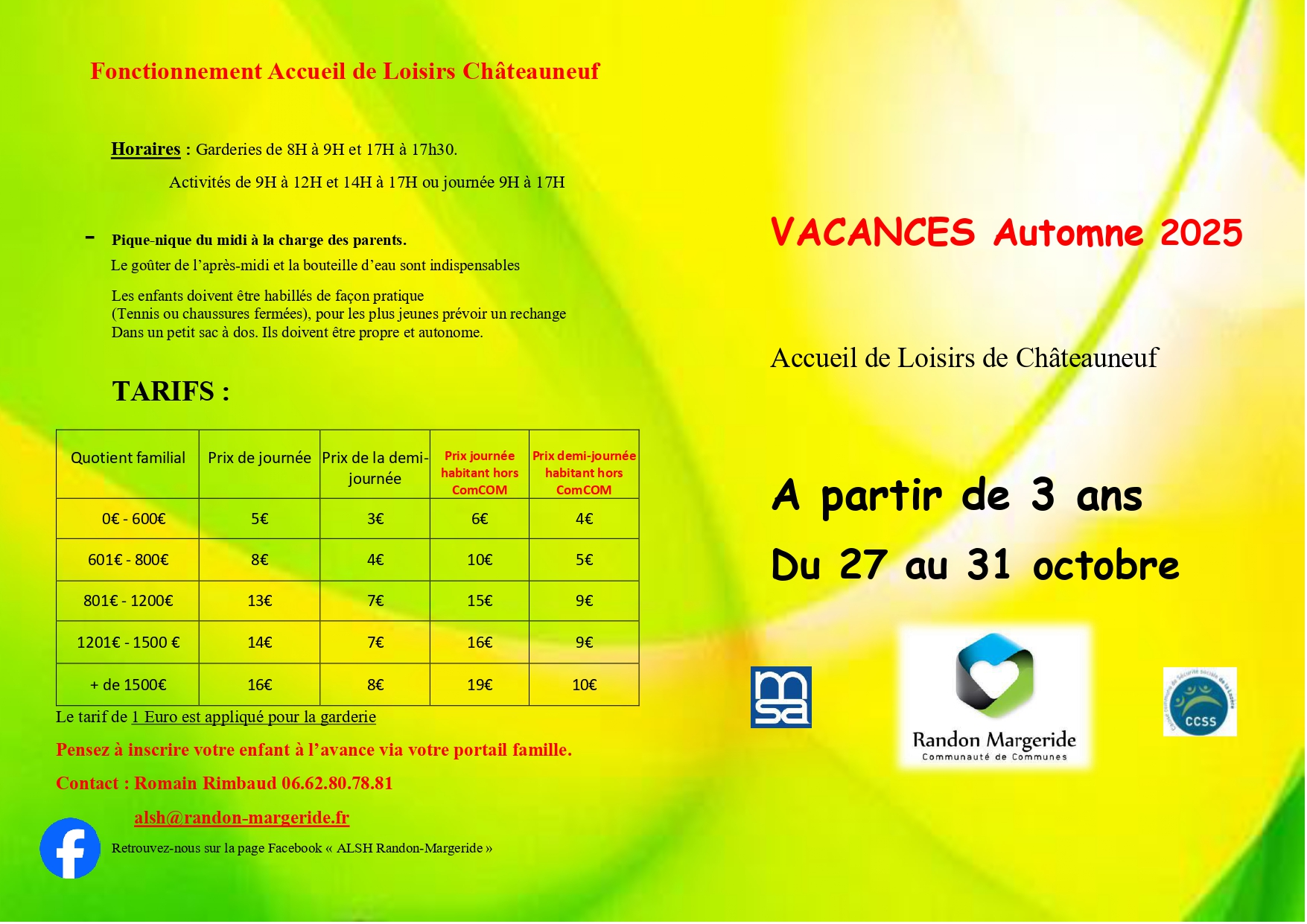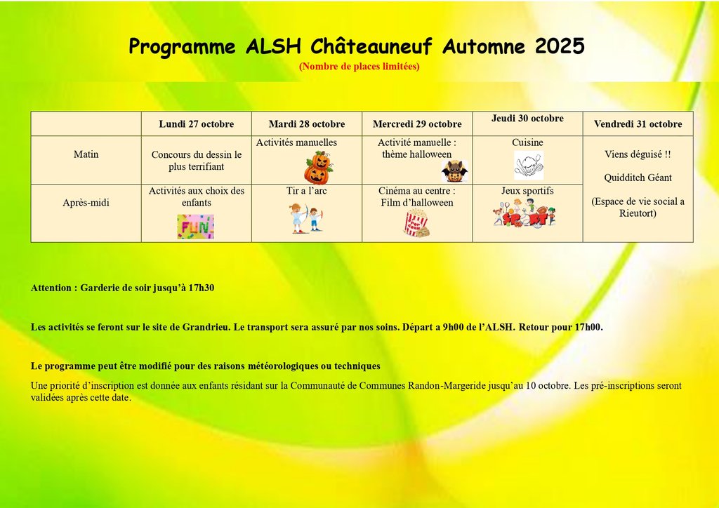 Les activités se feront sur le site de Grandrieu. Le transport sera assuré par nos soins. Départ de l'ALSH à 9h00 et retour à 17h00