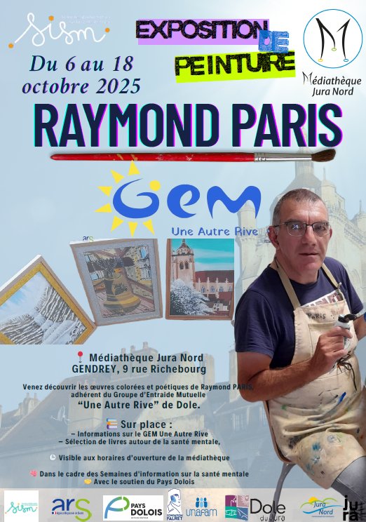 Nous avons le plaisir de vous convier à notre exposition de peinture réalisée par l’un de nos adhérents aura lieu à la Médiathèque Jura-Nord de Gendrey, du 6 au 18 octobre 2025.
