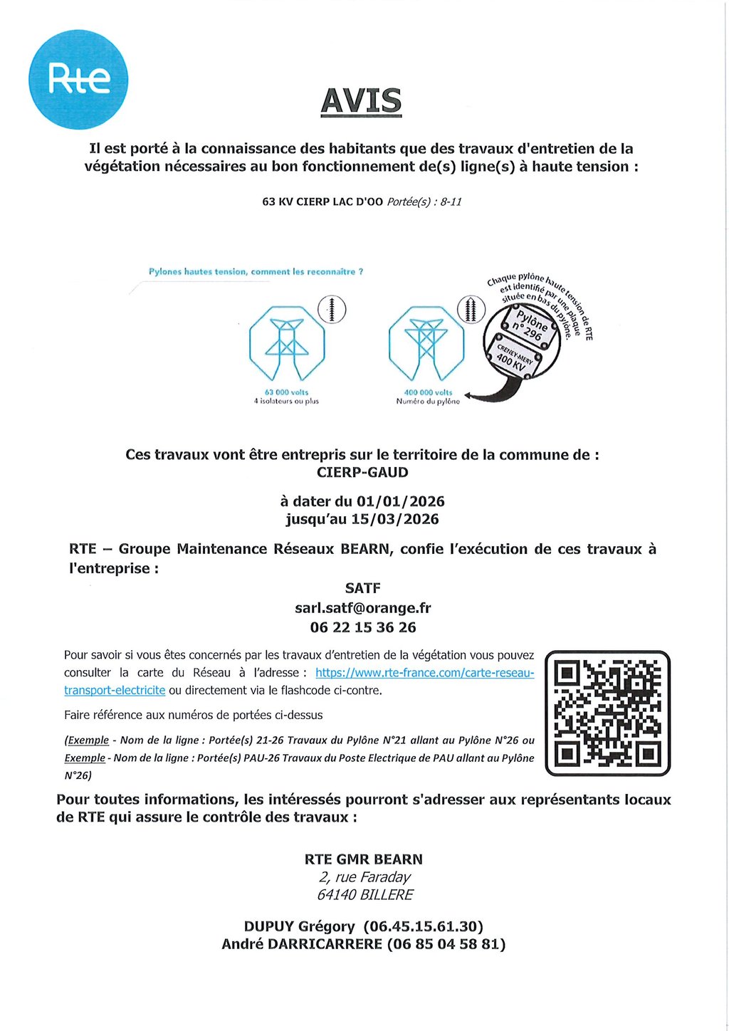 Pour toutes informations, les intéressés pourront s'adresser aux représentants locaux de RTE qui assure le contrôle des travaux :