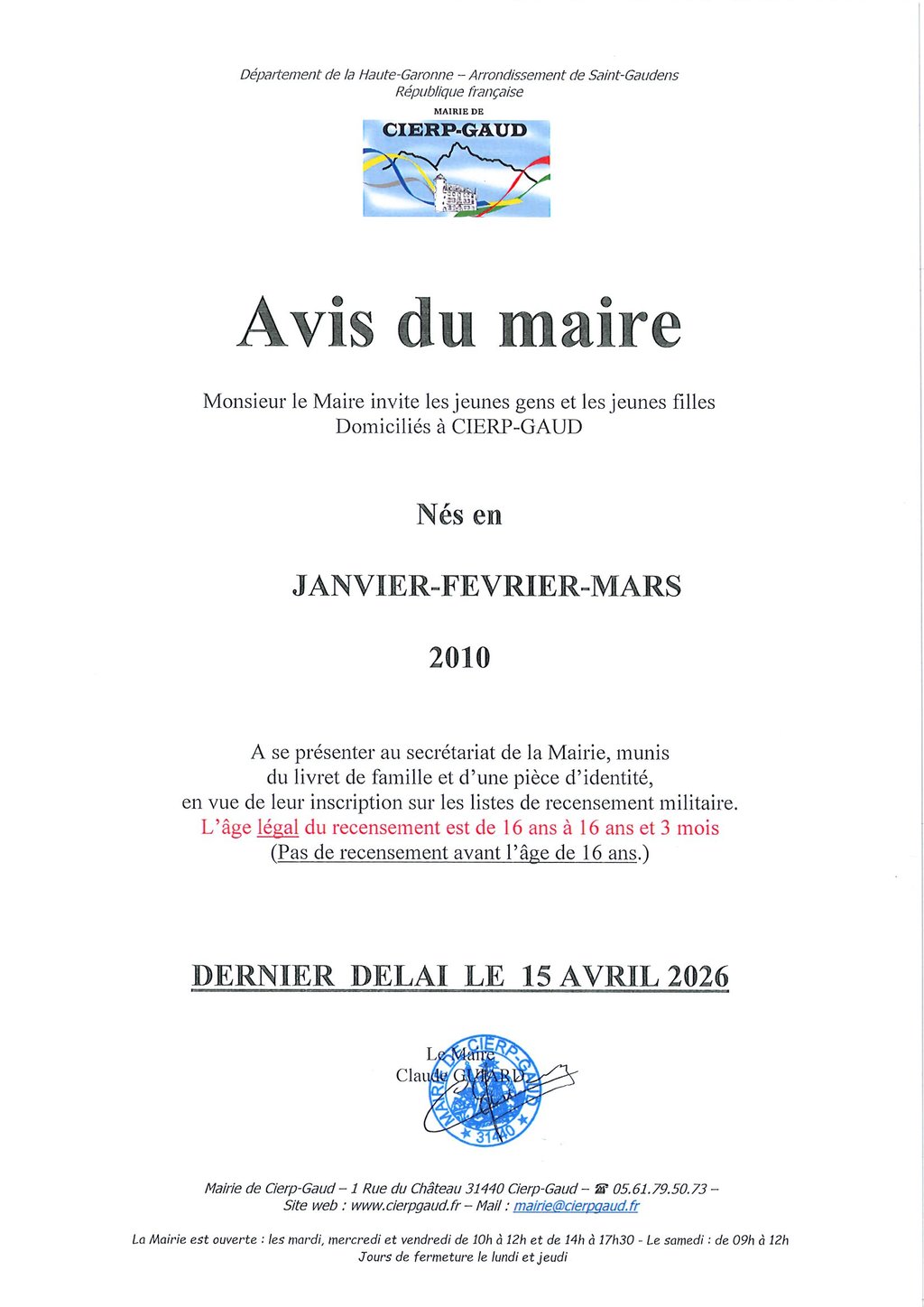 Monsieur le Maire invite les jeunes gens et jeunes filles domiciliés à Cierp-Gaud nés en janvier, février et mars 2010 à se présenter à la mairie en vue de leur inscription sur les listes de recensement militaire.
