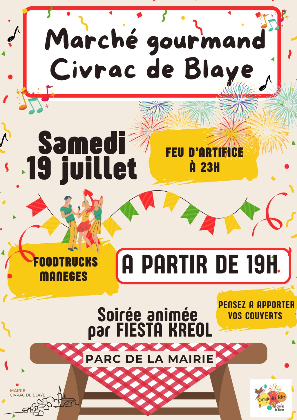 Participez au traditionnel marché gourmand de Civrac de Blaye, dans le parc de la mairie, le 19 juillet 2025 dès 19h.