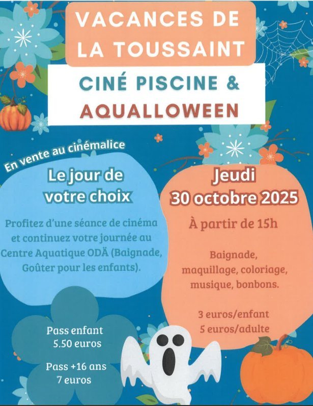 En vente au cinéma, pass enfants 5.50 euros, pass + de 16 ans 7 euros. Le jour de votre choix, continuez votre journée au centre aquatique, utilisez le pass ciné-piscine, baignade. Goûter (jusqu’à 17h30) .
