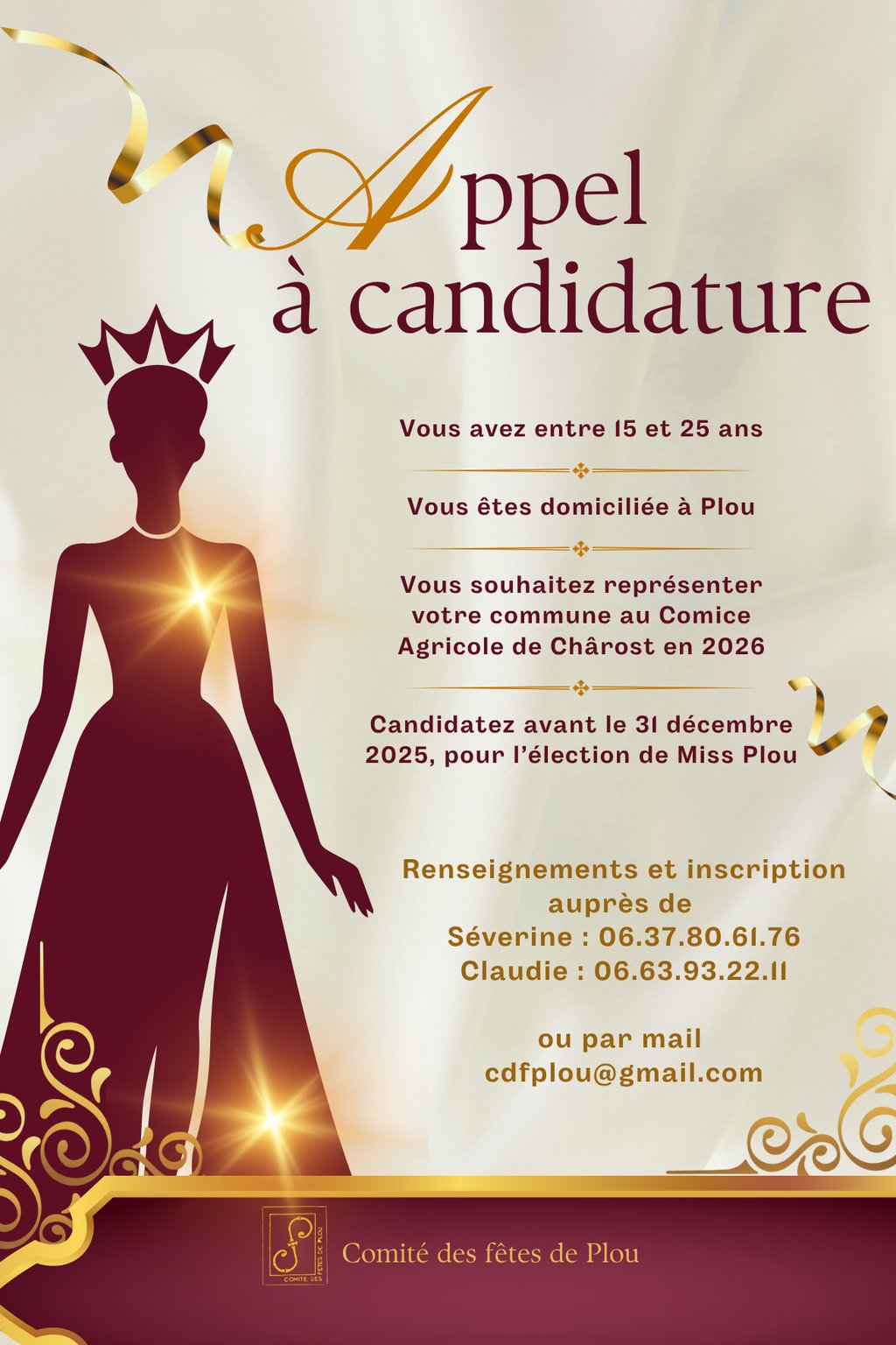 La soirée qui couronnera la Reine de notre commune se déroulera le 7 mars 2026 à la salle des fêtes de Plou. Un apéritif dinatoire clôturera ce moment festif.