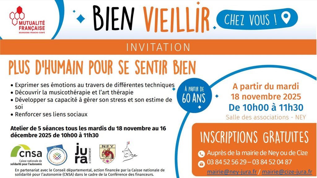 La Mutualité Française propose un atelier de prévention et de bien-être intitulé « Plus d’humain pour se sentir bien ». Cet atelier se déroule en cinq séances destinées aux habitants âgés de 60 ans et plus vivant à domicile : l’objectif est de maintenir une vie active, équilibrée, enrichissante et de rompre l’isolement.