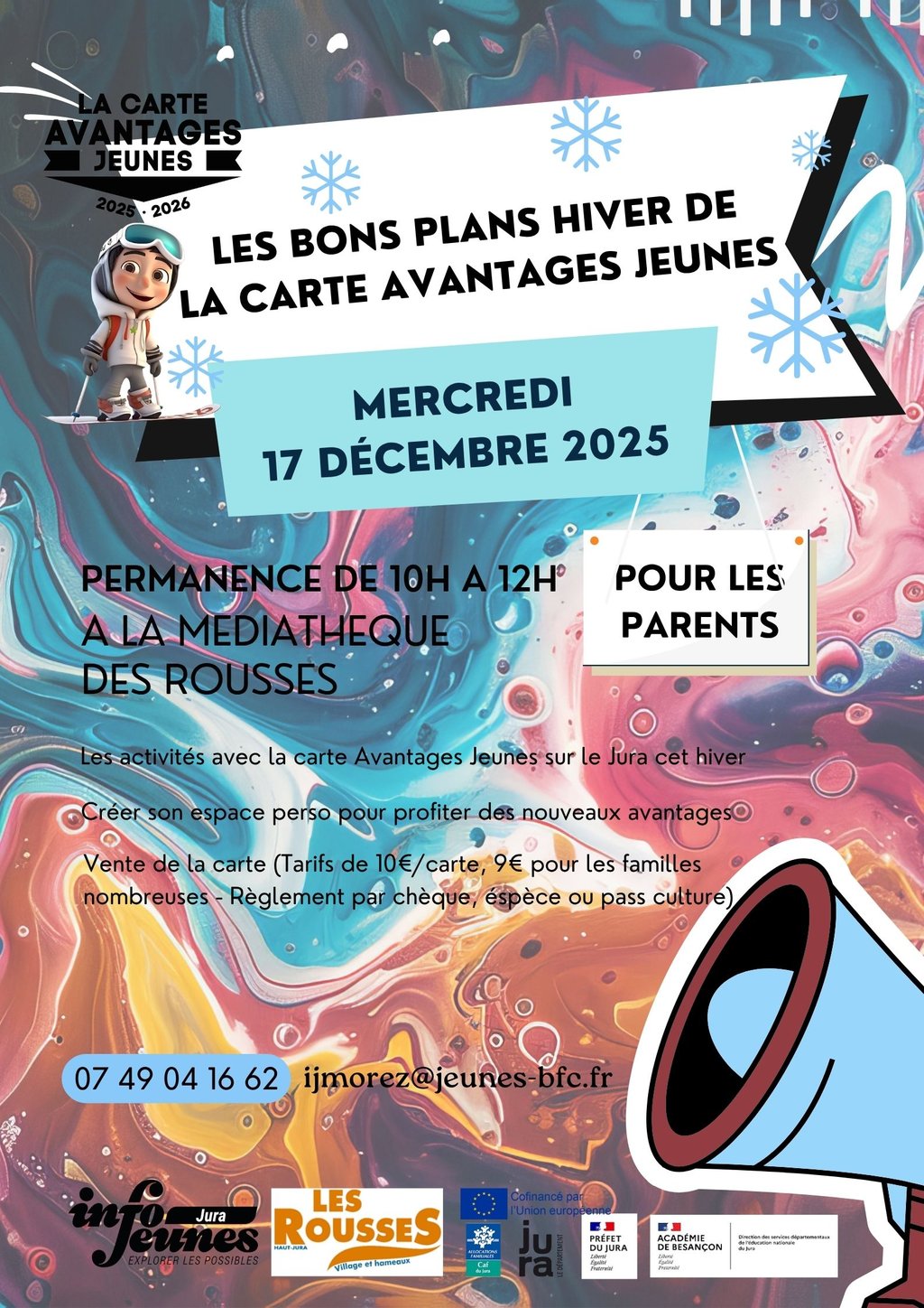 Cette séance portera sur les bons plans hiver proposés par la carte Avantages Jeunes. Elle permettra aux parents de découvrir les activités accessibles dans le Jura cet hiver grâce à la carte, ainsi que de créer leur espace personnel pour profiter pleinement de l’ensemble des avantages.