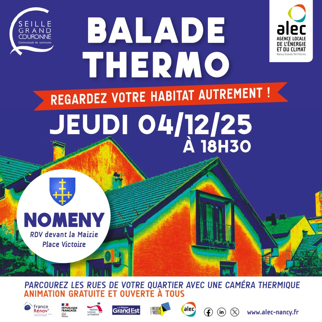N'oubliez pas de vous inscrire à la balade thermographie proposée par la Comcom et l'ALEC Nancy Grands Territoires le jeudi 04 décembre 2025 à 18h30, au départ de la mairie de Nomeny (Place Victoire).