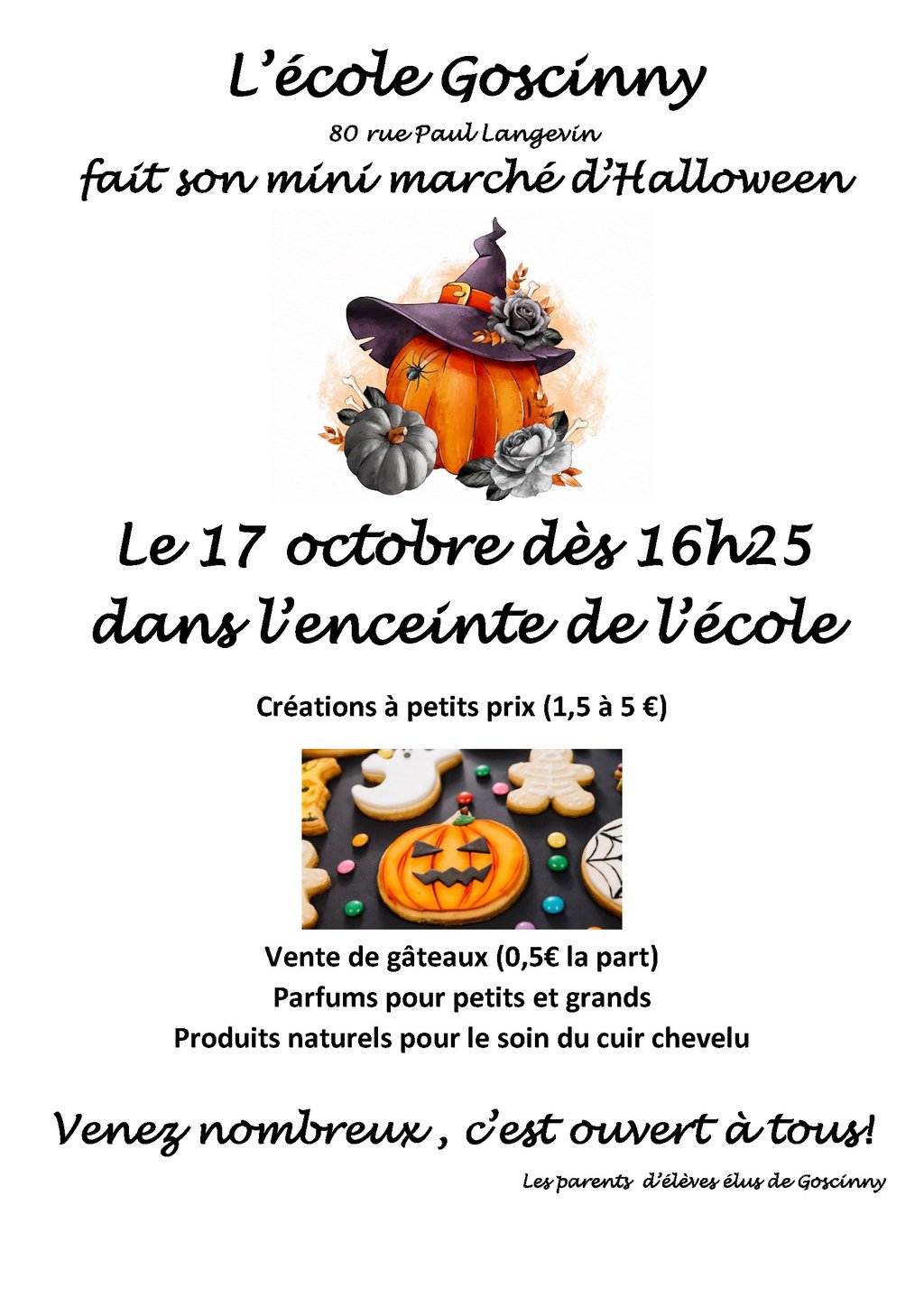 đ Cet aprĂšs-midi, les Parents dâĂ©lĂšves Ă©lus de Goscinny vous accueillent Ă partir de 16h25 dans lâenceinte de lâĂ©cole de Goscinny pour participer au Mini MarchĂ© dâHalloween.