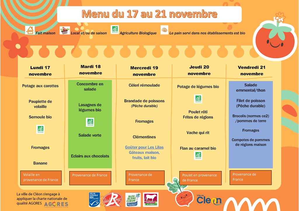 đ„ Retrouvez dĂšs Ă prĂ©sent le menu de la cantine scolaire, prĂ©parĂ© par les cuisiniers de lâUnitĂ© Centrale de Production des Repas (UCPR) de la Ville de ClĂ©on, pour la semaine du 17 au 21 novembre.