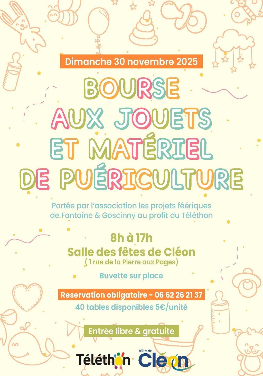 đ§ž Lâassociation les projets féériques de Fontaine et Goscinny organise dimanche 30 novembre dans la salle des fĂȘtes de ClĂ©on (rue de la Pierre aux Pages) une bourse aux jouets et au matĂ©riel de puĂ©riculture. Vous souhaitez rĂ©server une table (5âŹ) ? Appelez le 06 62 26 21 37.