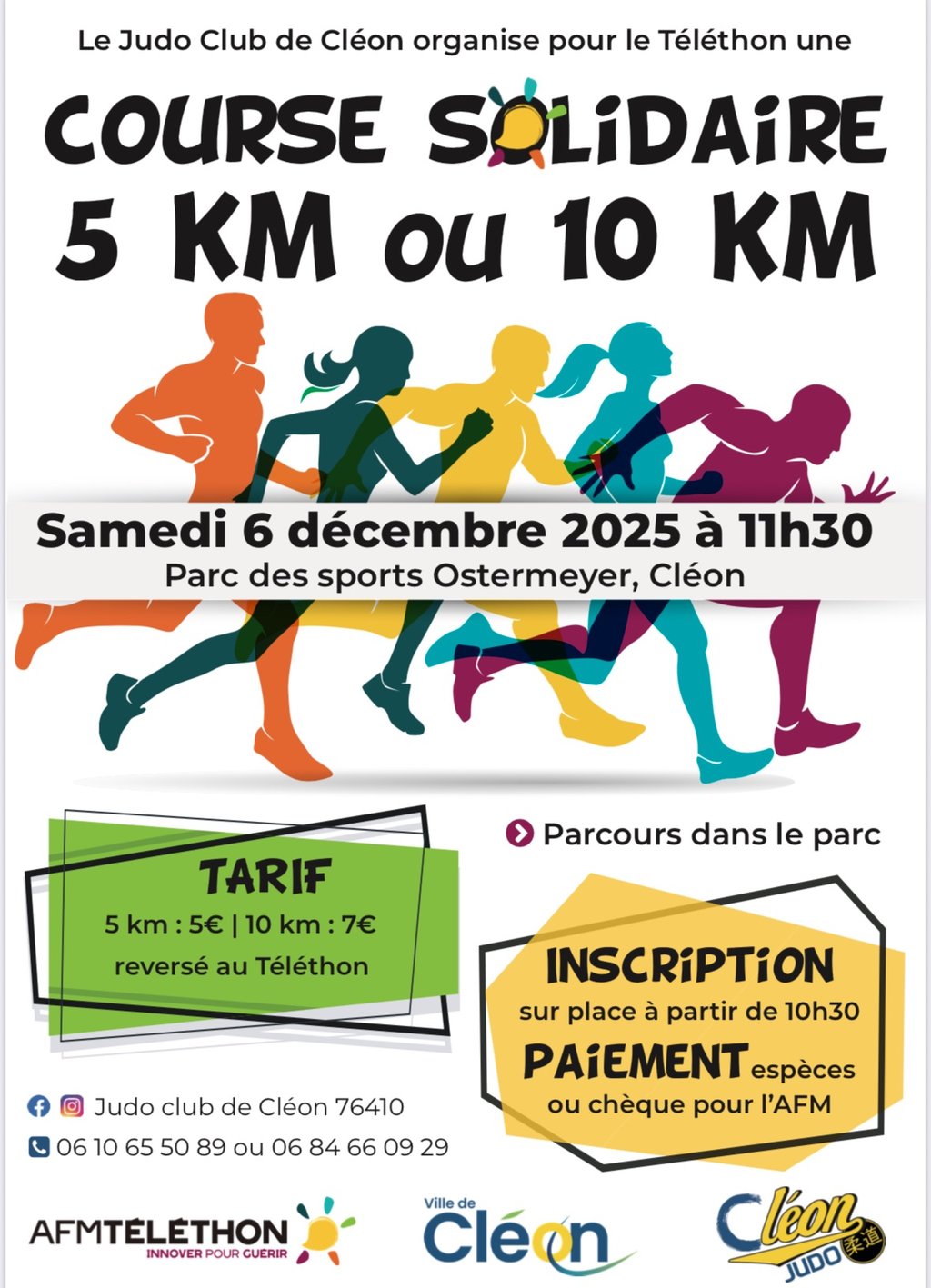 đĄ Samedi 6 dĂ©cembre, le Judo Club de ClĂ©on organise une course solidaire dans le Parc des Sports et des Loisirs Micheline Ostermeyer de ClĂ©on, au profit du TĂ©lĂ©thon.