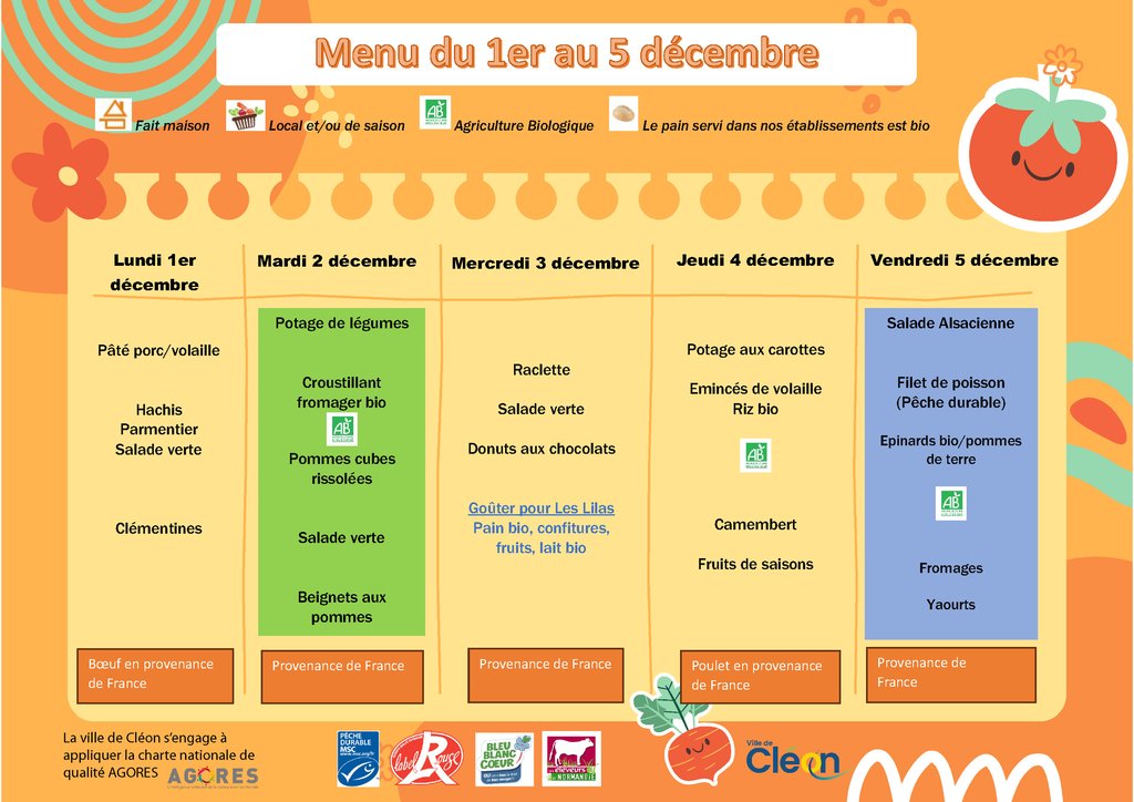 đ„ Retrouvez dĂšs Ă prĂ©sent le menu de la cantine scolaire, prĂ©parĂ© par les cuisiniers de lâUnitĂ© Centrale de Production des Repas (UCPR) de la Ville de ClĂ©on, pour la semaine du 1er au 5 dĂ©cembre.