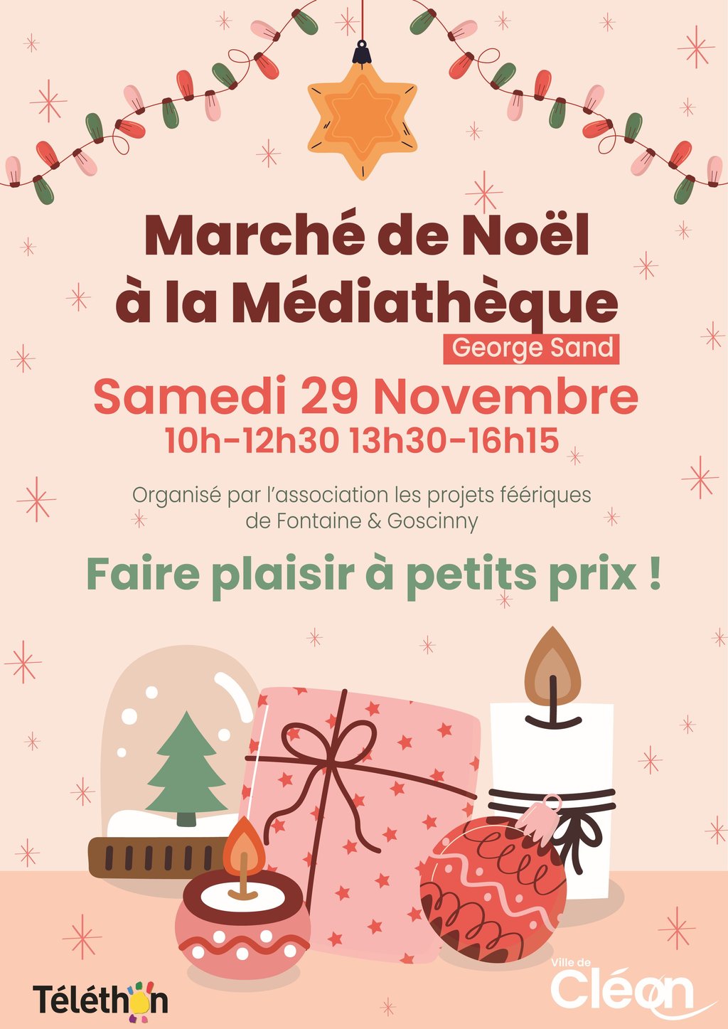 đź Les Projets Féériques de Fontaine et Goscinny vous accueillent samedi 29 novembre Ă la MĂ©diathĂšque (10h-12h30 et 13h30-16h15) pour un marchĂ© de NoĂ«l avec des crĂ©ations artisanales. Une tombola (2⏠le ticket) et un tournoi de Mario Kart (2⏠la partie) seront Ă©galement proposĂ©s.