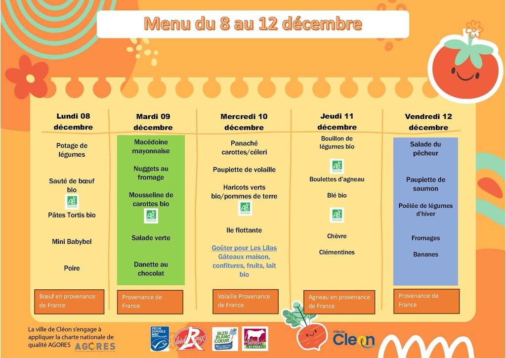 đ„ Retrouvez dĂšs Ă prĂ©sent le menu de la cantine scolaire, prĂ©parĂ© par les cuisiniers de lâUnitĂ© Centrale de Production des Repas (UCPR) de la Ville de ClĂ©on, pour la semaine du 8 au 12 dĂ©cembre.